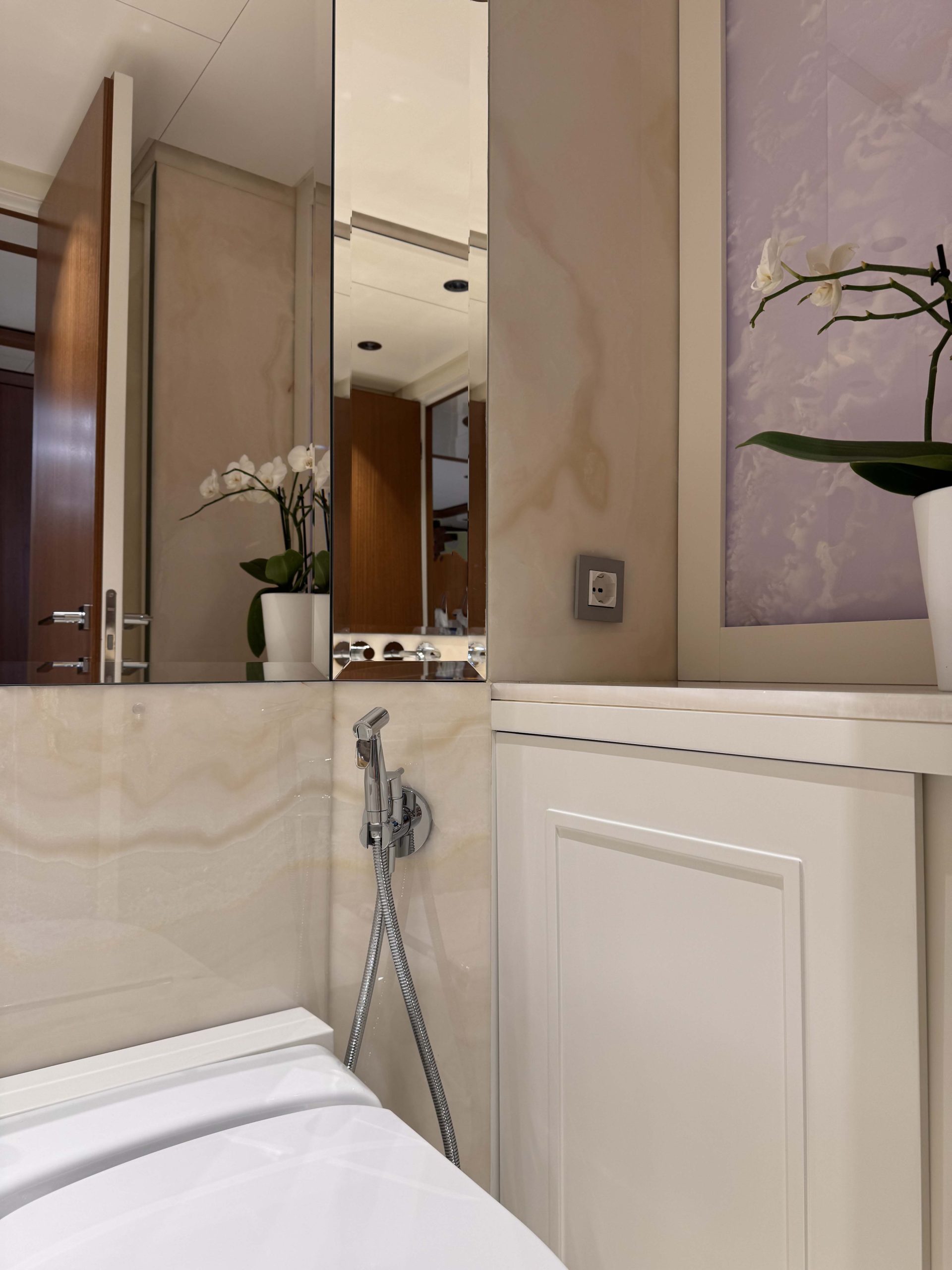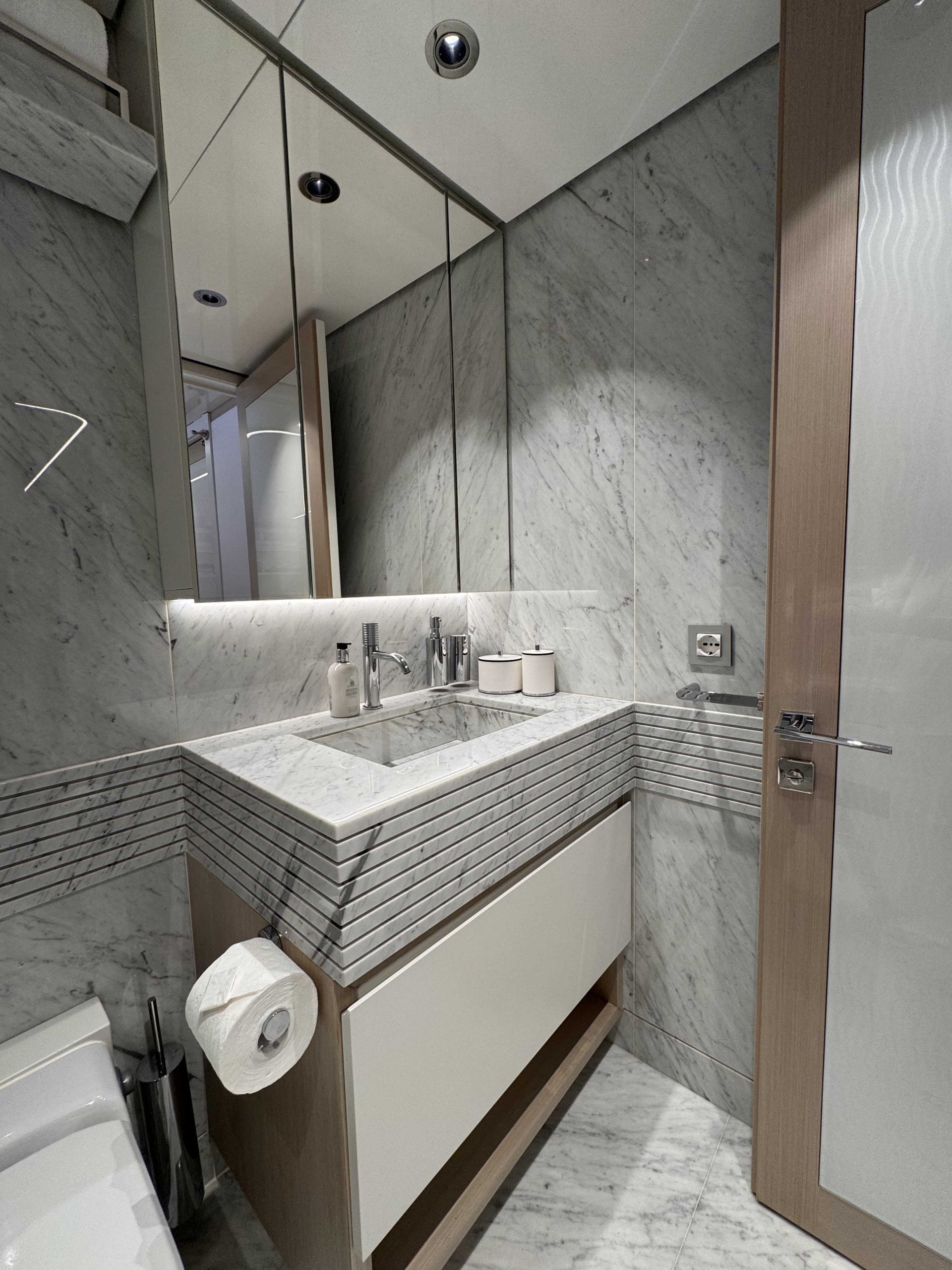 In un secondo bagno abbiamo utilizzato il classico Bianco Carrara. Le sue venature discrete si abbinano perfettamente ai toni chiari e neutri scelti per gli interni dell’imbarcazione.