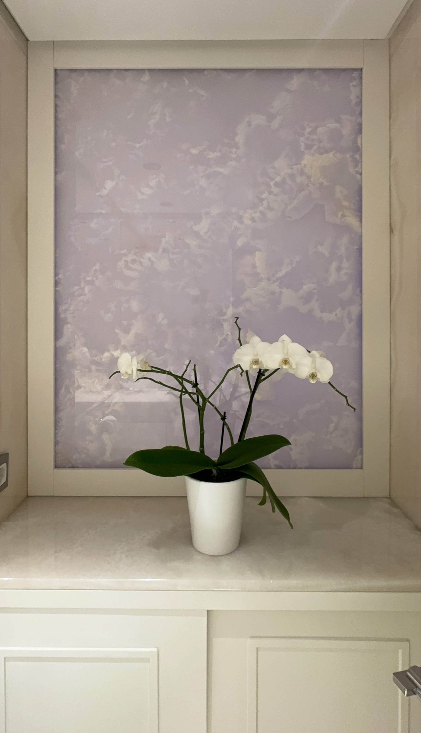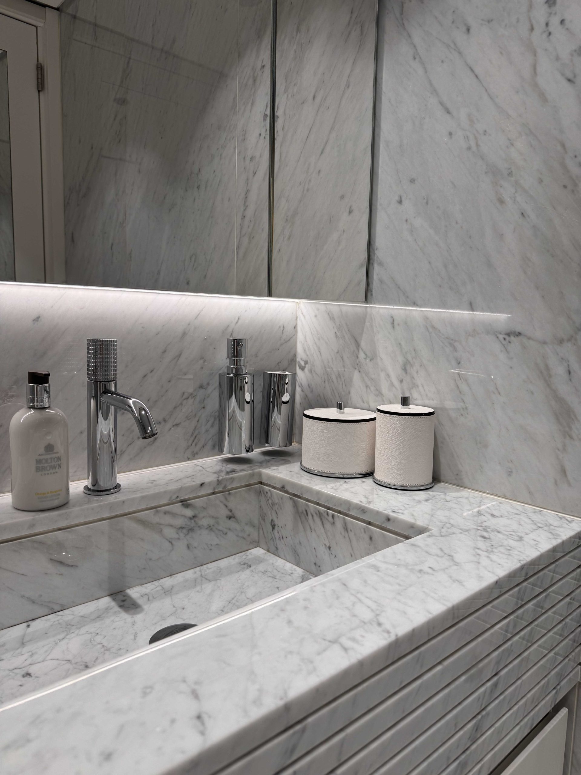 Per questo bagno, abbiamo introdotto un elemento di contrasto con la Sodalite per il lavabo. La scelta è caduta su questa pietra semipreziosa per il suo colore profondo e le sue sfumature affascinanti che diventano un punto focale visivo in un contesto prevalentemente chiaro utilizzando un Bianco Cristallino.