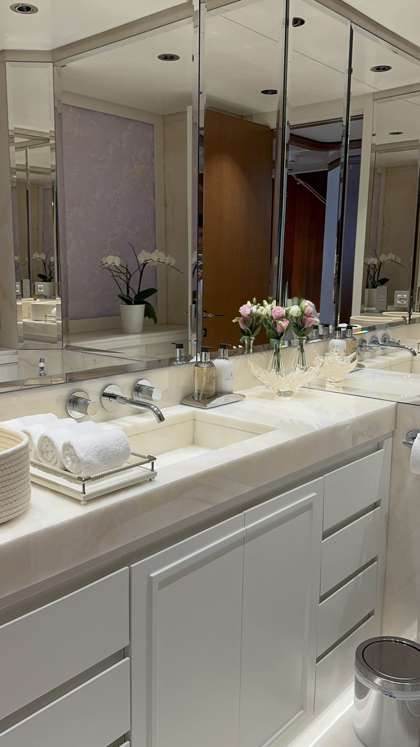 Il Benetti da 52 metri ha vissuto un’inedita rinascita grazie a un refit straordinario guidato dall’architetto Tommaso Spadolini e dalla designer Giulia Grassi dello studio Supernova Design. In questa bellissima imbarcazione abbiamo avuto l’onore di collaborare curando i rivestimenti in pietra naturale per i bagni, ciascuno con una sua forte identità.